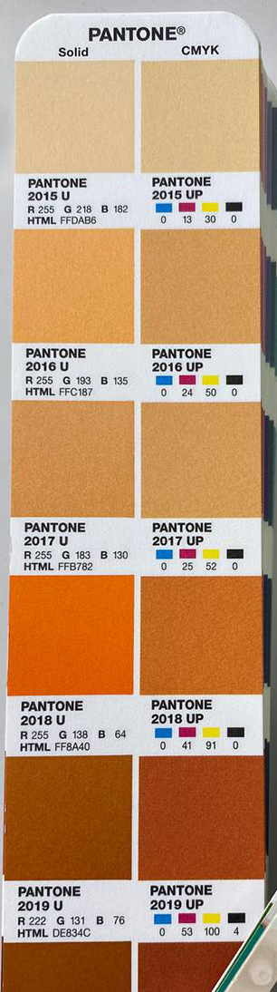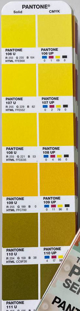 В такому каталозі пантонів позначений PANTONE з його номером, надрукований колір, поряд зазначений код найближчого за значенням цьому пантону СMYK. Такі каталоги використовують досвідчені дизайнери та друкарні. Деякі кльори однакові що в СMYK, що в PANTONE, деякі дуже схожі, але приблизно 30% кольорів PANTONE не можливо відтворити в кольоровій моделі СMYK. Тому дуже важливо на моменті створення брендбуку і вибору корпоративних кольорів перевірити чи є у вибраного Pantone максимально близький колір в кольороій моделі СMYK. Інакше при виготовленні різної поліграфічної чи друкованої продукції будуть виникати нюанси з кольором.