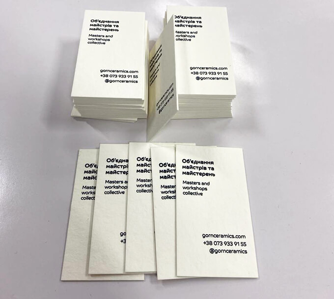 Друк візиток на білому папері: файл у форматі *pdf, колірна модель CMYK, роздільна здатність 300 dpi, шрифти перетворені у криві, виступи під обрізку по 2 мм з кожного боку. Враховуйте, що за 3 мм до краю готової візитки не повинно бути логотипів або текстів.